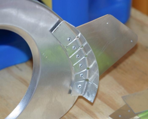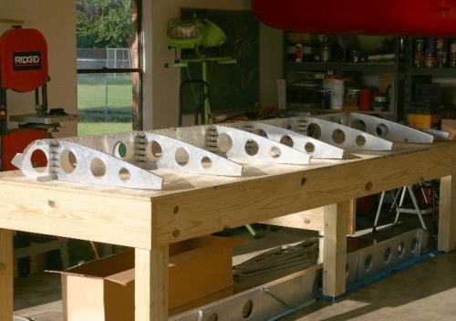 Began work on left wing. Nose rib āLā angle flanges were fitted and riveted to the four nose ribs and slat brackets. The center and nose ribs were clecoed to the spar, drilled to final size and re-clecoed to the spar. The root rib was fitted and clecoed in place. Total construction time now at 263 hours.