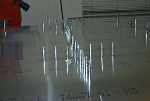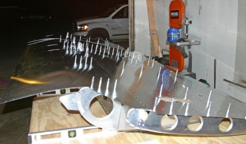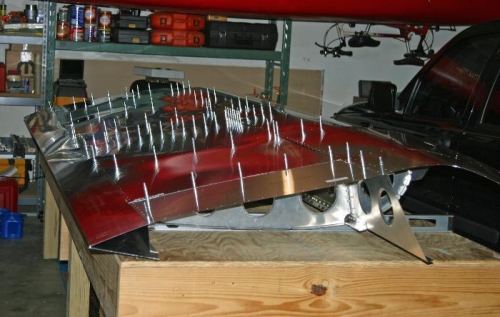 Left wing skeleton was riveted. Bottom skins, leading edge skin and trailing edge were clecoed in place. Started at the center of the wing and began drilling and clecoing skins to main and trailing edge spar. Total construction time now at 273 hours.