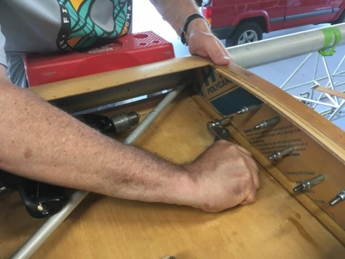 Michael spent approximately two hours preparing the plexiglass sides for the wing lockers. he used a belt/disk sander to shape the plexiglass sides, and then drilled an clecoed them in place in preperation for gluing them in. The clecos will be used as clamps while the adhesive sets up.