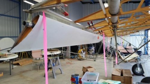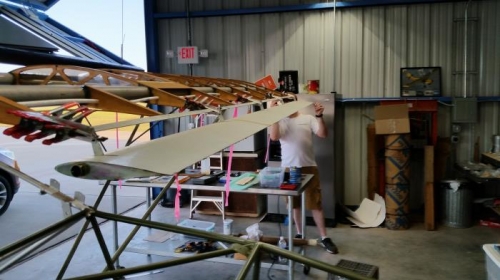 Decided not to bond the strips to attach the wing tips as discussed last week. Test fit the aluminum flapron hangers to the right wing ribs. Still struggling with flapron hangars on the back edge of the ribs. They won't work/fit the way the plans say they should as built. We decided to move the attachment aft 1/4" from the plans and shim the bottom to suit the situation on each hanger. We drilled the top of the outboard hangar and celcoed it in place on the rib. We then attached all the other hangers using clamps in the same manner and then bolted/celcoed the right flapron in place on the hangers. We were able to aline all the hangers. See attached photos.