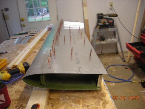 Removed bottom skin & deburred. Reinstalled and reiveted back together. Folded over the skin on top and drilled all holes. Removed clecos and deburred.