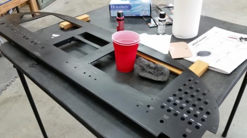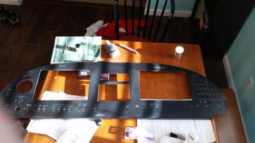 It turns out I didn't take any pictures while at the Laser engraver/Powder coating guy's shop. This was a very difficult process. The laser wasn't large enough to fit the entire panel, the drawing I had was not scaled correctly, and just getting the labels positioned perfectly was quite a task. I ended up spending about 15 hours at the laser shop before it was all finished. These pictures were taken when I got it home and started to brush on the acrylic paint. I would let it dry over the labels for about an hour, then I would wet sand. The labels would then crisp up and be very nice looking. Finally I clear coated the panel to help protect the label paint.