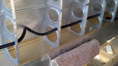 I ran corrugated wiring conduit full span in both wings. This results in a very clean design. However, it was very time consuming pulling through all the ribs.