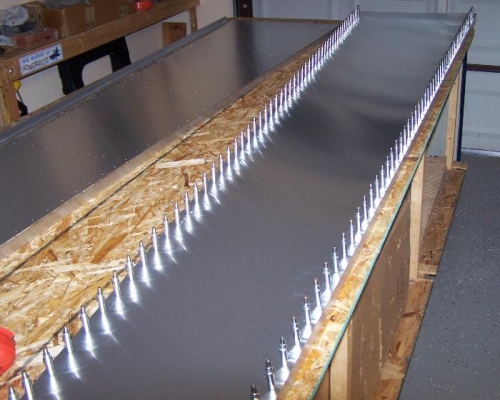 Drilled and cleco'd into position. Upper edge stays just cleco'd for now - have to fit the turtledeck before final up-drilling and riveting.