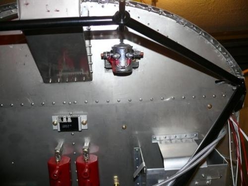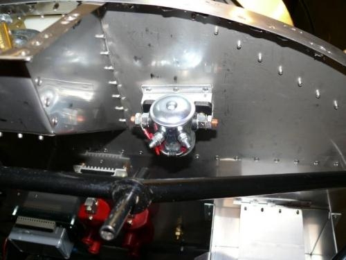 I had decided late-to-need that I would install a master relay. Unfortunately, the best spot to install this is close to the battery on the upper firewall. Unfortunate because the fuel tank is already installed, so ya just can't waltz in there with hardware. I fabricated a stand-off using .032 stock. Bent a channel in it and riveted that to the upper firewall (was careful not to puncture the tank while drilling). I then used AN3 hardware to fasten the relay to the channel. The channel allows a wrench to slide in to grasp the nut.