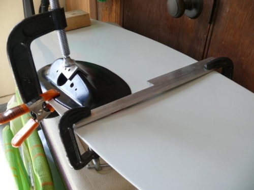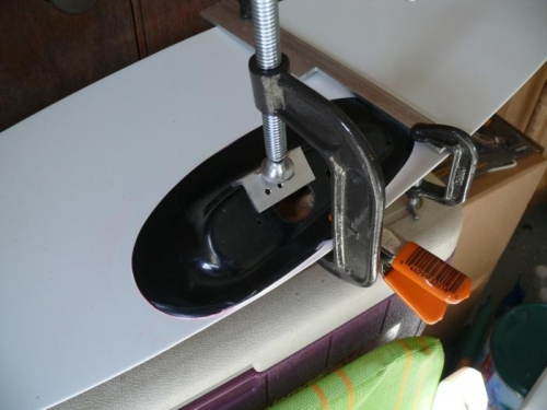 I filed a flat into aluminum angle to support a C-clamp as shown in the pics below. Then, I noticed a few spots where the edges were lifting up on the pod, so I had to apply additional clamps to pull them flat. Of course, the clamps would slip off, the pods would slip out of position, etc. so it was quite tedious getting them set up.