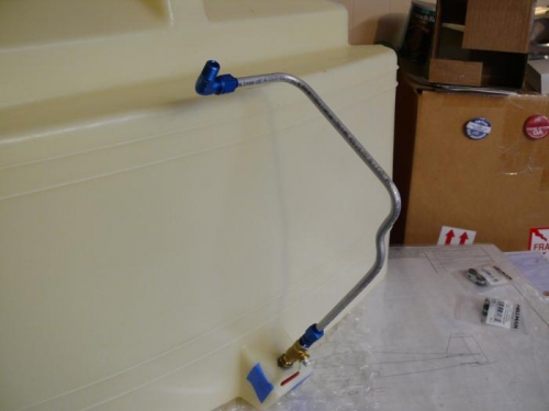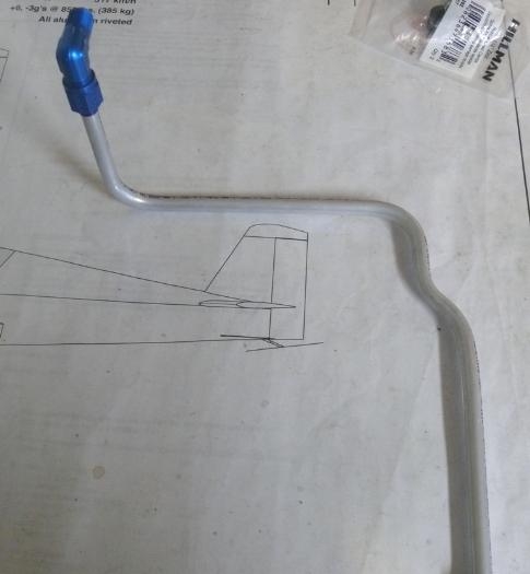 I had previously marked locations on the inside firewall to visually spot the fuel line so that it would enter the tank fitting correctly. Today I bent the fuel line to fit. First made the 90 deg bend from the gascolator over to the centerline of the airframe. Added another 90 deg bend to point towards the tank. This was problematic, since it was right up against the rudder pedals, and was also off the centerline of the fuel tank. Did two 45 deg bends to jog the line back over to the centerline.