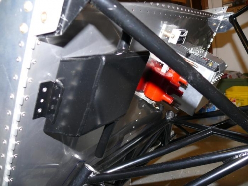 The air/oil separator instructions state that it can be mounted with either AN hardware or rivets. I chose rivets. I do not intend to plumb the return line back to the engine. Well, at least, not at this point in time. If you *do* wish to do this, the separator must be mounted above the oil level of the engine. I re-mounted the engine mount to ensure I had clearance, and marked the location of the separator. Drilled, deburred, and riveted into place.