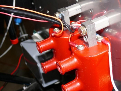 The secondary ignition is electronic, driven by hall-effect triggers on the back of the flywheel, that then fire two coils mounted on the firewall. This is in comparison to the primary ignition, the magnetrons.