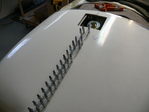 Did the work in two shifts. First, the centerline hinges were drilled in place on Friday, and the cowl unit was still on the workbench.