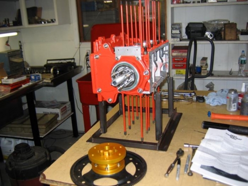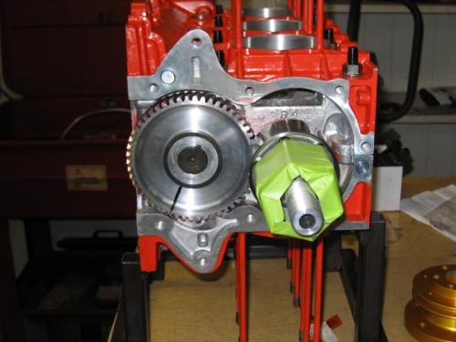 The bearings arrived today so we were able to close the case, torque the ARP case bolts and install the Weseman 5th bearning. In terms of mic'd dimensions, backlash, and rollout everything is looking really nice and smooth. After that, we added the ring gear and prop hub. Mark milled the Weseman 5th bearing cover for the Alternator mounting bracket. He also installed the cover case alignment dowl and the oil fitting. We discovered that the oil pan was not constructed properly. So when I got home I ordered a WW Gold Oil pan