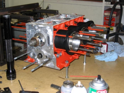 He completed the left side cylinder jug installation, installed the heads, rear oil assembly, oil pickup with the newly arrived oil pan and finally adjusted the valve timing prior to shipping to CC#19.