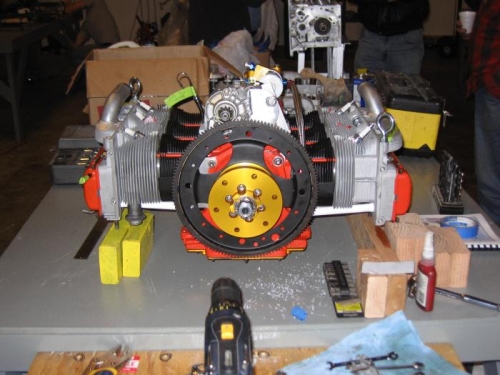 I arrived at CC#19 and uncrated the engine. The engine looked beautiful and I received a lot of questions and compliments on it. I then removed the plugs and shipping valve covers for replacement w/ mine coming with WW to the college. I attempted to install the starter and WW reviewed the process with me. I had to align the stater gear w/ the ring gear and adjust the backlash using a 1/16" drill bit for spacing. Once that was done I drilled into the starter ear to lock in the height adjustment. I then had to fabricate from angle the rear starter mount. I was able to fabricate the rear start with the gracious help of Cal, a member of the CC crew who permitted me to use his band saw and belt sander locate in his T-hangar. I then went into Barnswell to purchase some 1/4, 5/16 and 3/8 course thread hardware (all 3/4" in length). I then installed the left & right side rear case shrouds.