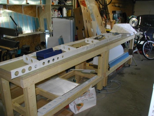 Rivetage des demi-longerons avants HS-902 avec le renfort HS-907 et les brides HS-908 Rivetage des demi-longerons arrières HS-903 avec le renfort HS-906 et les pattes HS-912 Rivetage des nervures HS-904 intermédiaires 2 et 4 des 2 cotés