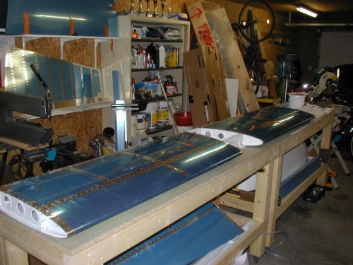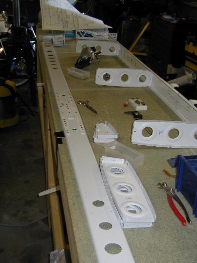 Rivetage demi plan fixe gauche (suite) Rivetage des nervures HS-904 sur le longeron avant. Insertion de la cale HS-909 pour la nervure intérieure Rivetage du longeron avant avec la voilure Rivetage des nervures avec la voilure