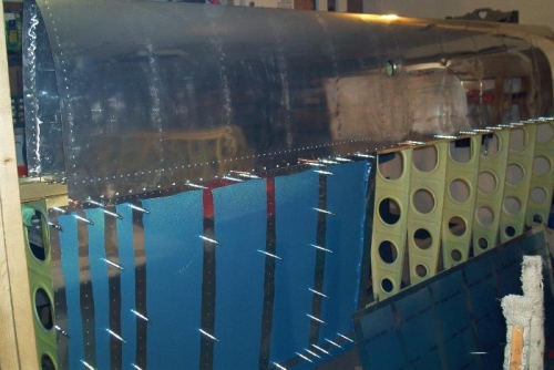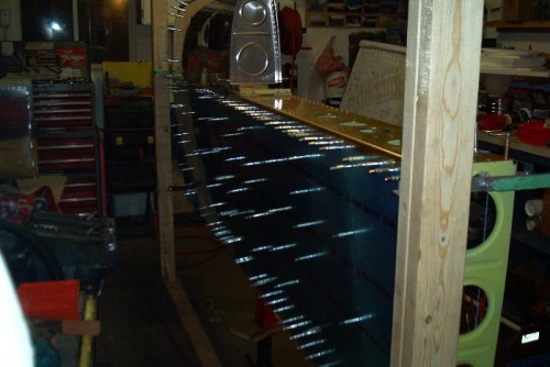 Randy and I finished riveting the wing skin to the left skin and built the holder for the wings. Then we put up the right spar to the uprights and placed all ribs to the spar and trailing edge.