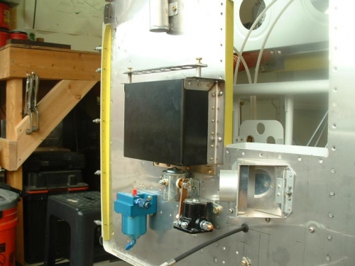 This weekend I continued working on modifying the battery box installation. I replaced the angles for mounting the bat box with some that I fabed out of .032" stainless. Since my battery box has a hinge installed on the bottom to allow it to rotate forward to for clearance from the brake reservoir, I wanted to install the attaching hardware for the angles front to rear. The angles included in the kit from Vans had the pre-drilled holes for installing the nutplates on the angles. I could have used them but there would have been a lot of empty holes. I also temporarilly installed the master and starter relays. I fabed up the firewall doubler and need to prime and install it before I can mount the relays permanently. I ran the wire for the elevator trim servo thru the bulkheads but I'm still waiting on parts to complete the install. Maybe next week.