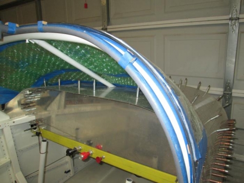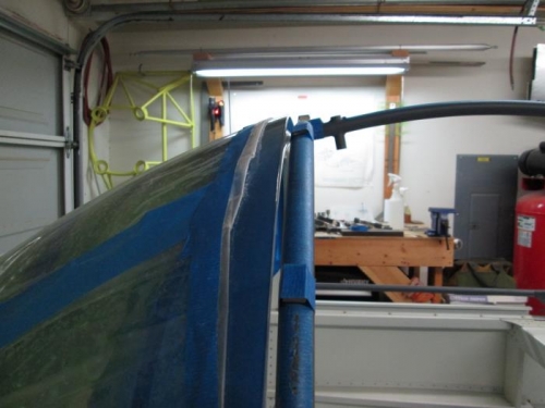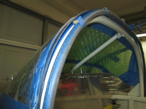 Now that the windscreen is final trimmed and in place, I put the sliding canopy in place to check the fit. And the fit is terrible! The forward bow of the sliding canopy frame doesn't match the roll bar at all. As the pictures show, I had to shim the canopy off of the frame to get it to match the windscreen. Over 1/2" in places. I have no other option but to cut the forward bow off of the frame and try to re-bend it to match the roll bar.