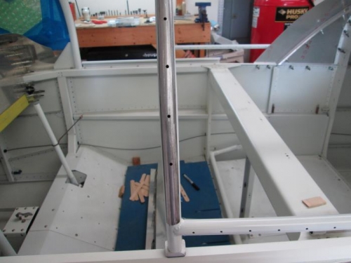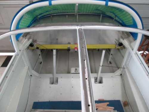 Today I prepped the canopy and frame to be bonded. I plan to use 3M 5200 adhesive to bond the two together. I called Todd from "Todds Canopies" in Florida and talked to him about what prep work was required for this adhesive since I have never worked with it. He told me to rough up the plexi-glass with 80 grit sand paper and drill holes in the frame every 2-3 inches. I did this and wiped both parts down with acetone. I placed the plexi on the frame and positioned tongue depressor sticks around the bows to get the right height and to allow a gap between the frame and plexi to apply the adhesive.