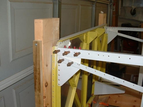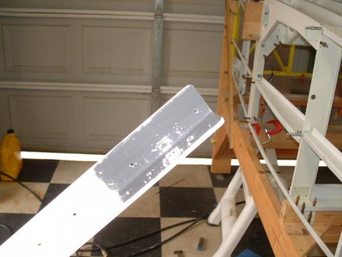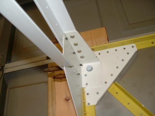Today I permanantly attached the lower fuselage angle structure to the firewall. I used close tolerance hi-loks instead of the AN3 bolts that the drawing calls for. I had them laying around from my days with Delta Airlines. Sice this is a pretty critical spot I think the hi-loks will be stronger. I applied sealant on the faying surfaces since they are dissimular metals.