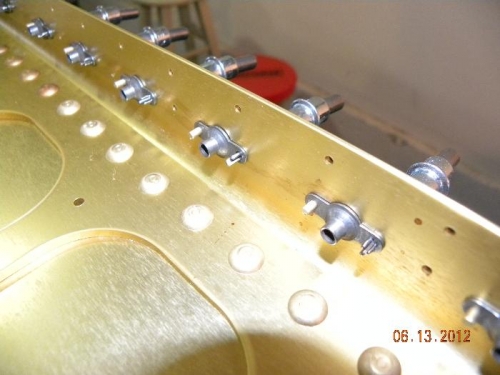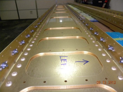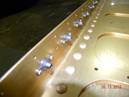Riveted the K1100-8 dimpled plate nuts to the countersunk and primed holes in the top and bottom of both front spars. These plate nuts will be used to fasten the leading edge fuel tanks to the main spar.
