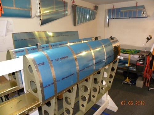 Riveted the leading edge assemblies to the main spar. Was able to use combination of hand and pneumatic rivet squeezer for four of the seven ribs in each assembly by accessing through the lightening holes in the main spar. The remaining three inboard ribs have no access holes so these need to be riveted with a gun and bucked from the inside by reacing your arm inside the leading edge through the nose ribs. I was able to do the first two inboard ribs solo but had to get help from the wife to reach in for the third. She did a good job bucking these rivets and inspecting by feel.
