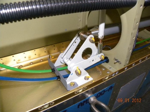 I fabricated a bracket from some scrap aluminum sheet. This bracket is secured to the bellcrank and installed two snap bushings in the bracket to feed the Pitot and AOA plumbing lines through. This will secure the lines from interfering with the bellcrank as they pass by.
