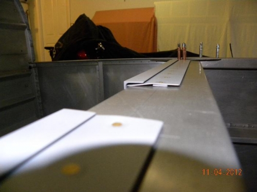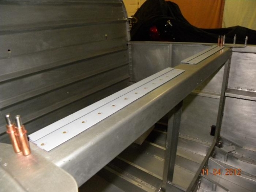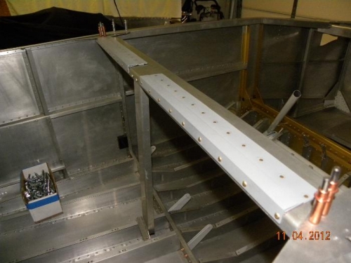 The 705 bulkhead (just behind the seats) is mostly put together and temporarily blind riveted in place. One major portion left off is the F705-J,K,L pieces that support the seat back upright (two available postitions.) THese are mostly fabricated from angle and sheet, and are not pre-drilled. I fabricated and primed the pieces and riveted in place.