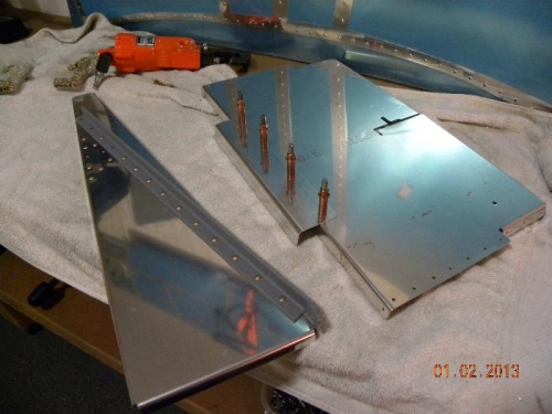 Fabricated and riveted the stiffener angle and backup plate to the center rib of the forward fusealge. I also fit the center rib into the slot of the subpanel, which requires twisting and contorting the subpanel quite extensively to make it work. This scratched the primer and aluminum all to heck, so needless to say these wont be coming apart again, i will prime them just how they are.
