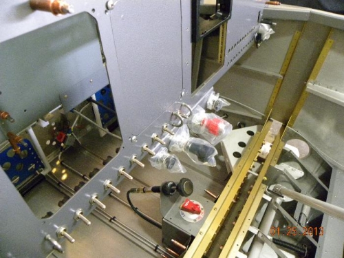 I drilled holes in the control bracket and installed all the control linkages for the carb heat, throttle, mixture and cabin heat. Also fastened to these lines to their Adel clamps under the forward deck, which firmed everything up nice. I hope im not ahead of myself here, as it will be a pain to remove the panel now (the control bracket is screwed to three nut plates so it could be dropped off the bottom of the panel - jit would just be a PITA)