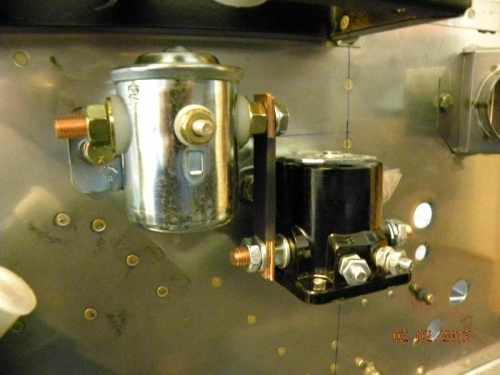 Installed the master relay and starter solenoid on the firewall and connected with copper buss bar