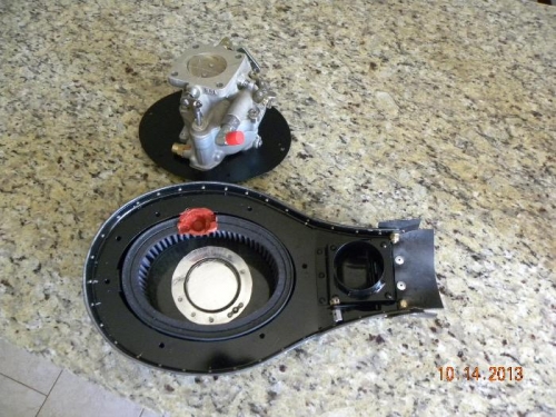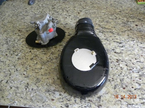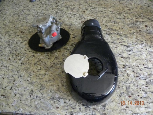 After final finishing of the filtered air box i put a finish coat of engine paint on it and riveted it together. Here you can see the carb mated to its attacment plate. This whole assembly gets bolted to the underside of the engine.