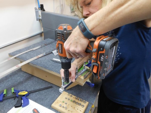 Finished up the preparation and fabrication of the baggage door and the forward top skin and the understructure. Terri got comfortable with using the pneumatic squeezer on both the forward baggage bulkhead flange, the instrument panel flange and the firewall flange, and learned to countersink with the drill on the baggage door hinge support.