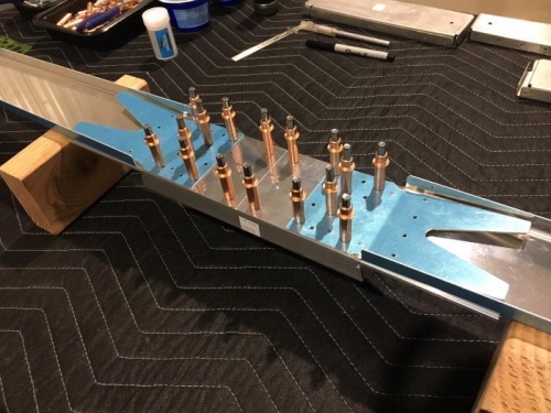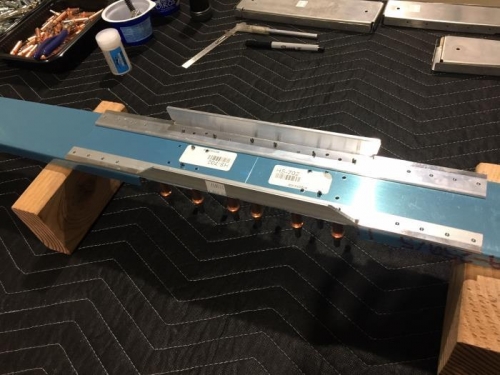 Started work on horizontal stab forward spar.Cutout and cleaned up HS-00003 spar doublers. Clecoed HS-810 and HS-814 reinforcerment angle and splice to spar. Instructions said to measure and clamp HS-00003 doublers into postion in the spar channels and then match drill the inboard holes. As it is, 2 stamped holes in each doubler, spar and angles matched which allowed me to cleco toghether and align things well. Match drilled inboard holes and all holes out to the spar bends. Next up bending the reinforcement angle, splice and spar.