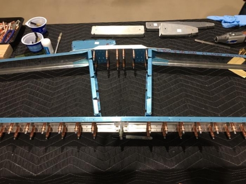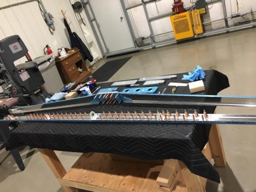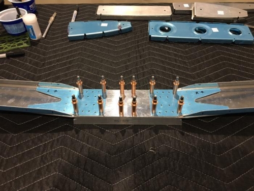 Continued work on H.S. front spar. Trimed inboard flanges on both HS-702 spars to clear inboard ribs. Cleaned up relief notches in spars a bit more. Made the bends in both spars. Very happy with bends as the spars, angle and splice pieces and reinforcement plates all match up well. Clecoed all together to check fit and had to lay rear spar along with front spar for a pic.