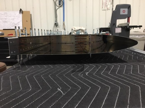 Finished a little more edge work on the Ribs for the H.S. Also edge prepped HS-702 Spar. I had left the rear spar built up so it was time to break it down and mark all pieces. Edge prepped HS-603PP rear spar. Marked and drilled aft flang holes on both leading edge ribs. Clecoed left hand Stab skeleton together using both front and rear left side spars and ribs. Matched drill HS-705, 707 and 708 ribs. Prepped left stab skin by removing plastic film from the inside and using a soldering iron to melt through and remove plastic from rivet lines on outside of skin. Finally clecoed skin to left side of stab. Yeah, looking like an airplane part.