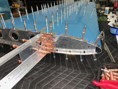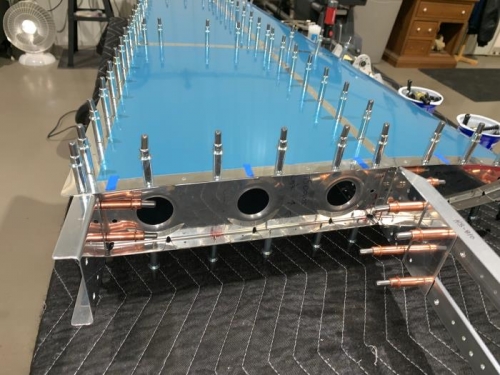 Finished up working on inboard ribs HS-0005 and HS-0006. Clamped in place and match drilled ribs using skin as a guide. Measured and drilled 5/8" hole through Spar HS-702 and HS-00003 spar plate for manual elevator trim cable. I am installing electric trim and probably didn't need to drill this but did anyway incase things change in the future. Matched drilled holes in HS-702 spar from center rib inboard and then reamed to size remander of holes in the skin. Removed skin and finished drilling all remaining holes in HS-702 spar, HS-0003 plate, HS-810 and HS-814 reinforcing bars. Left stab build up complete on to the right side. Right stab buildup should go much quicker.