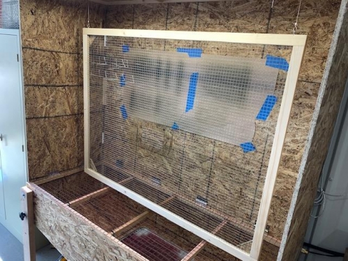Built a rack with 1/2" spaced hardware cloth to hang parts on in paint booth. Fabricated some hanging hooks out of .040 safety wire that can be moved around on rack to hang parts from. Concept unproveing along with paint booth. Fingers crossed my ideas prove successful.