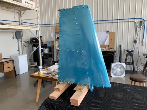 Peeled of the inside vinyl from vert stab skin and clecoed the skin onto the frame. Matched drilled skin to spars and ribs using a #40 reamer.