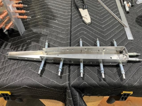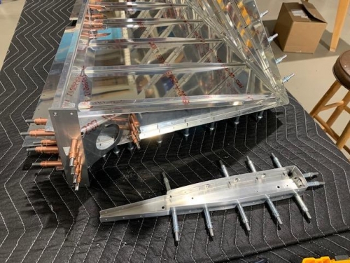 Clecoed R-713 to R-703 and did additional fluting and forming flanges on R-703 to fit right and also align properly with skin. Matched drilled all holes on R-713 and R-703 along with R-801PP skin. Have gone off script with the plans here as trying to get all worked completed before priming and making the trailing edge bend. Match drilled all spar reinforcement plates with spar. Match drilled all R-710, R-405PD, R-704 parts and with R-802PP spar where applicable. Clecoed spar assembly to one side of the skin and matched drilled all holes.