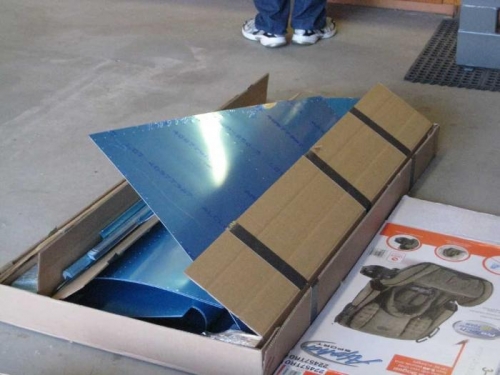 Cut the tape on the boxes and inventoried all the parts (100%). Those folks at Van's are on the ball! The elevator skins have a slight smile but that shouldn't hurt anything. Funny thing... they were on the inside of the box, protected by the horizontal stab skins.