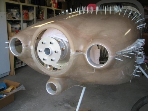 Layed up the fiberglass flanges between the big rings and prop opening to support the cowl halves at the center section. Chucked up a sanding drum and finished and fit the big air inlet rings.