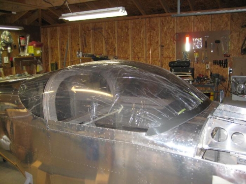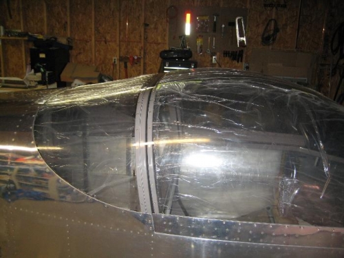 Put the canopy frame back on and screwed the plexiglass in place. It seems like holes that used to align perfectly, don't anymore. I guess it's just the nature of the beast. Anyway, it looks good enough to start the fiberglas fairing on the front of the canopy.