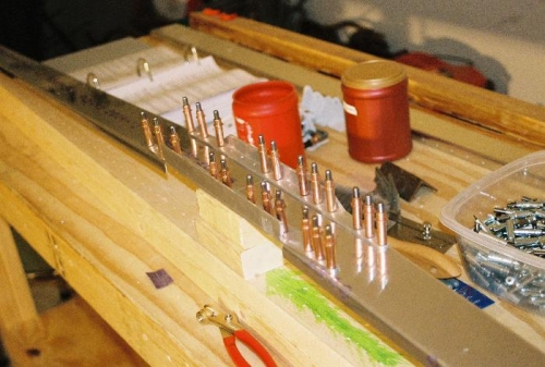 Riveted front spars. Had to use bucking bar and rivet gun to drive rivets as squeezer couldn't reach over the ridge of the angle. Practiced on scrap angle first.