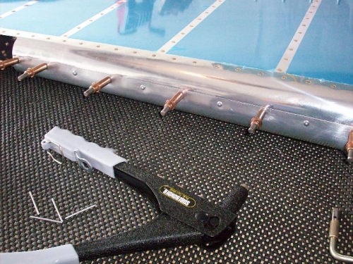 Rolled rudder leading edge with broomstick, Cleco'd and put in the sun to relax. Matchdrilled leading edge holes.