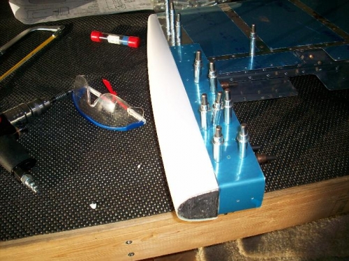 Took skin over to David Clays to use his bending brake to crease trailing edge. Used a dowell rod I think was a little too thick to bend enough. Dimpled and prepped counterweight and test fit fiberglass tip over it. Instructions call to remove more lead for balance purposes. I skipped this for now as I want to find a better way to remove material and want to be closer to knowing how much weight really needs to be removed after building Left elevator with the electric trim motor in it. Again, my theory of better safe than "cut it off 3 times and its still too short..."