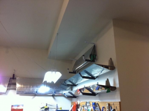 Today, I began inventory of the QB wings and fuselage. Things went easier then I expected, although the neatly packaged parts took up a lot more space once opened. So, a new project began to mount the larger parts on the wall. Following my idea for the HS, I mounted the ailerons on one set of racks, and the flaps each got their own set. The majority of the "large parts" were inventoried, but the box of small parts remains...and will be expected to take some time!