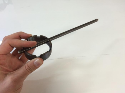 Here's a tool made to engage the ring on the back of the vent after the overhead console is already in place. It worked like a charm. With the ring positioned by hand, install the steel rod into the notches and turn. Re-position the rod...and keep turning.