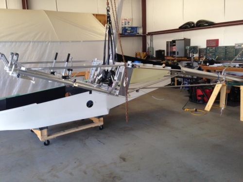 Used a chain hoist attached to the center of the hangar, and with the help of some assistants, the process went very well and surprisingly easy.