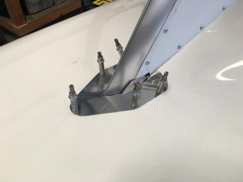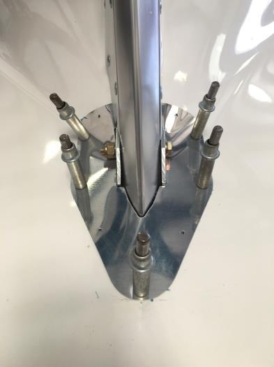 So today, I took another approach, using something I am more familiar with: Aluminum. I made a simple cover, from .016 Aluminimum, that contours nicely with the turtledeck, and fits very colse arounf the pylon. It will still require some caulking, but I think it look MUCH better than the over-powering fiberglass.